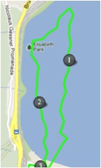 I was surprised by the fact that despite looking up to sight, I just couldn’t see the enormous fluorescent orange bouys that I was supposed to be swimming towards; so I just kept following the swim caps ahead of me. Once I’d reached the first bouy, you swam across the width of the lake to get to the second one. There was a bit of a current and I was forced to swim at an angle to try and maintain a straight line. I was swimming solo by this point with no feet to follow, which made sighting and pacing even harder. After the second bouy it was a straight line back to transition (or it should have been!) – (see picture right)