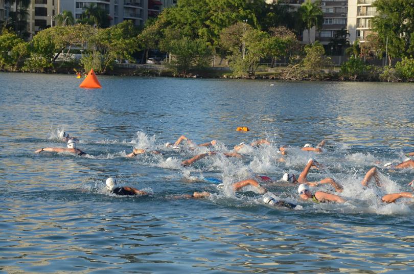 The swim start line was small so quite compressed but I got in the water early and picked a nice central position. The 5 second count down was in Spanish which didn’t help but on 1 I started swimming and managed to get a good uninhibited start. Within 50m I dropped into my rhythm and was well set up directly between the 2 groups vying for the lead, I waited another 20m and took my best guess on who was going to be quickest. At that point I cut across a guy trying to draft the leader of my chosen group and stole the prime position behind him (there are no friends when it comes to swim drafting). Within 300m it was clear our group was quickest and by the first turn at 700m the 2 of us were clear of the rest (if I hadn’t cut the guy off I could have been dropped by now). At this point I had a decision to make as we were now starting to hit a lot of traffic (back markers from previous waves), my guy was taking a wide line and obviously adding distance to the swim so, I could stay with him and swim further, but easier, or I could go it alone and swim more direct but exert myself more. I chose to race clever and stuck with my guy. For the next 800m I tucked behind my guy and literally started planning what I would drink post race… would it be a beer or a mojito or should I just have both? With my mind in the bar I was rudely awoken with 400m to go by increasing chop and a head on current created by the exposed entrance to the lagoon we were swimming in.