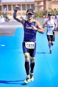 By the time I arrived back at T2 the sun was high in the sky and the heat very noticeable. As expected earlier in the week, the run was going to be a hot affair and so it proved. The two lap loop, each one 11km, took us out of the Atlantis car park, right onto the crescent and out along to the end where the Rixos hotel is situated, before heading back to turn just before the main Atlantis Hotel roundabout and back towards the car park to either do the second loop or turn into the finishing chute. My initial lap was slow, as in almost painfully so, and I definitely walked at the aid stations, which were thankfully spread apart at ideal distances to take full advantage of the ice sponges on hand and which I pretty much kept under the shoulder straps of my tri top for the entire race, refreshing them at each station whilst also slurping down flat coke on more than one occasion. I also started grabbing handfuls of ice from the sponge buckets to suck on as I ran, although called time on the practice near the second turnaround once I saw how filthy the water was becoming in the buckets on account of the sponges being collected off the road and then naturally put back in the bucket. Still, ignorance was bliss and I didn’t end up ill. In fact, thanks to ice sucking and sponges used as shoulder pads, I kept my heart rate sufficiently low to permit a really decent pace on the second lap. If my first lap was slow then my second was lightning, as I literally turned the corner onto lap two and felt something within just roar and energy suddenly surge to my legs. I am not certain of my pace for the second lap as I kept my Suunto on the HR screen, keeping my rate at no more than 165 beats per minute (bpm) for lap 1 and then between 170 and 180 bpm for lap two, permitting it to go to max as I ended the run and basically sprinted. What I am certain of is that I felt awesome on the second loop – it would appear that I have become a slow burner: start sluggish but then finish on fire. One of the most satisfying bits of the second lap was when I ran past some guy who simply uttered, “Shit!” as I stormed by. That was sweet and always makes up for the feeling of slight inadequacy that comes on the bike as people pass me, although I am getting less bothered by this as I know I have a plan and that if I stick to it then I will invariably catch and pass them on the run. Why oh why the energy surge can’t come earlier is a mystery as it would be great to tap into it for the bike, but there you go. My body does what my body does!