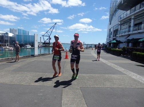 Out along Princes Wharf and then along the Waterfront past ports of Auckland. All I can hear is the cheering crowd, screaming out random names, cheering everyone on. Coming past all the aid stations being greeted with singing and dancing volunteers, sprayed with a hose, slapped on the butt; what great motivation. I don’t remember Aucklander’s being this friendly sober… Coming back towards transition to complete lap one of two, friends and family there again, cheering at every step. I am feeling exhausted at this stage, the turn around marshal has a dangerous job telling 1100 exhausted athletes that “you have one lap to go…”. I make the turn and head out. Half down, half to go. Keep moving forward Chris. The second lap seemed to pass faster than the first (although it didn’t in reality), the sun is burning now as everyone trudges along. I was surprised to see a familiar race kit in front of me. I got to run the last 3km with Luke Porter, a former TriDubai member now living in NZ. Unfortunately for him it was only his first lap. But it was good to talk for a few KM, keep each other moving at a good pace.