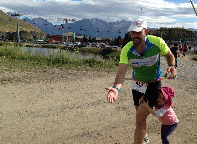 A slow and stiff transition followed. Fortunately a lot of spectators shouting forced everyone into a run and I was off. The first 3.5km of the run felt all uphill. It was on a mixture of gravel roads and off road which was different and very scenic. As it was at the top of Alpe D’Huez there were superb views to the valleys below and surrounding mountains withe the setting sun (I hadn’t been quick). There was a bit of running a fair bit of walking and then the turnaround and the second half of the lap was mainly downhill where I actually overtook people as 95kgs can get a good momentum if you let it. More high fives (and a rugby tackle) to the families at the end of lap 1 and beginning of lap two and I wasn’t feeling too bad.