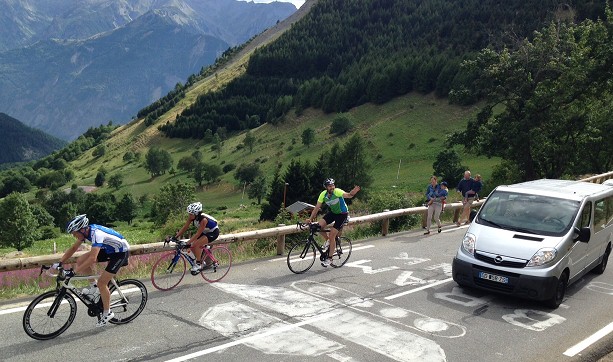 A quick and fumbling change into my Alzheimer’s Society cycling gear and I was off up the steep exit ramp (remember to put your bike in its lowest gear) and it was off on around 25km of downhill to the bottom of Alpe du Grande Serre for a pretty tough and steep introduction to the mountains. With the number of competitors, it was hard not to draft on this first section and the race referees were pretty sensible as there wasn’t too much to be gained in any case. Alpe du Grande Serre is a steep, tough start to the uphill element of the ride. Pretty much straight into the lowest gear and that was where it stayed for the next hour and a half to the top. I was consistently passed all the way, including by Douglas, and kept holding onto the thought that they would blow up eventually. I’m not sure they did but it kept me sane.
