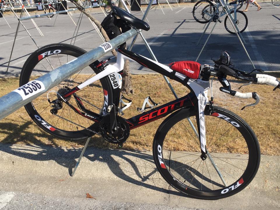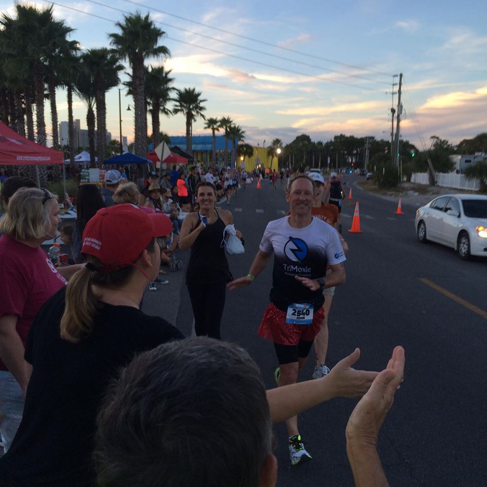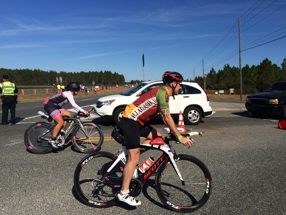 The worst part of the bike course came around mile 74 when we turned right for an out-and-back section which began into the wind, again, with some long uphill stretches. Nothing too steep (it is Florida after all), but fairly soul-crushing anyway. I’m not a strong cyclist, so I dropped into a very low gear, tried to keep my cadence up, and waited and waited for the turn-around to come. Finally, it did, and I was able to relax for a few miles. From there, I had two simple goals left: 20 miles to the bridge and then 12 miles home. The closer I got to the end, the more people I saw on the side of the road with flat or other mechanical issues. I heard there was some broken glass shortly after coming down off the bridge, but I never saw it. Good thing too, or else I would’ve totally freaked out because ability to change a flat is limited in a race environment.