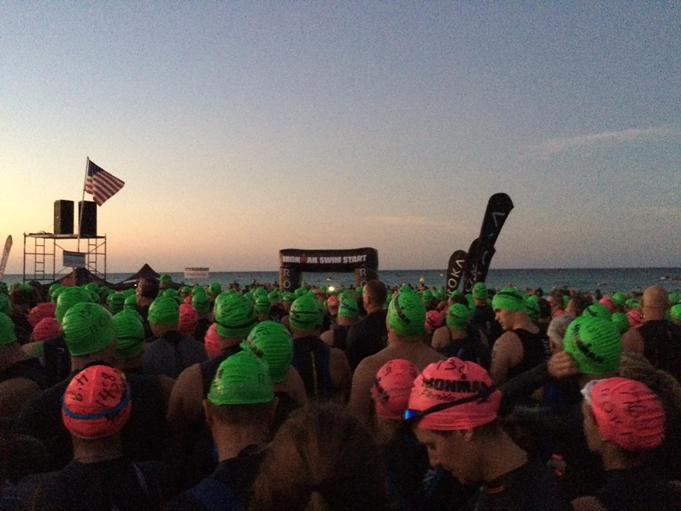 My alarm went off at 430am, but I was already awake. Mary gave me these instructions in my pre-race brief: ‘You won’t want to eat. Tough. Eat anyway.” She knows me too well. I reluctantly ate half a Clif bar and opened a bottle of Powerade. The next 50 minutes were spent sitting on the couch trying to wrap my mind around what I was about to do, sipping on my drink, and running to the bathroom. Holly and I left the condo at 525 to drive to the race. She dropped me off at the run turnaround point where they were collecting the special needs bags for the bike and the run. I handed mine over and walked over to transition. I pumped up my tires, filled my aero bottle with water and put my Tailwind bottle and extra water bottle into their cages, hit the porta-potty (surprisingly short line), and went to find Holly. Our meeting point was at the first trash can to the right of the walkway exit onto the beach, and she was there waiting for me.