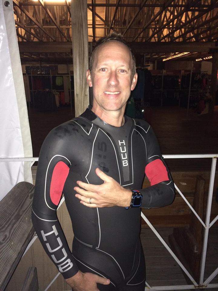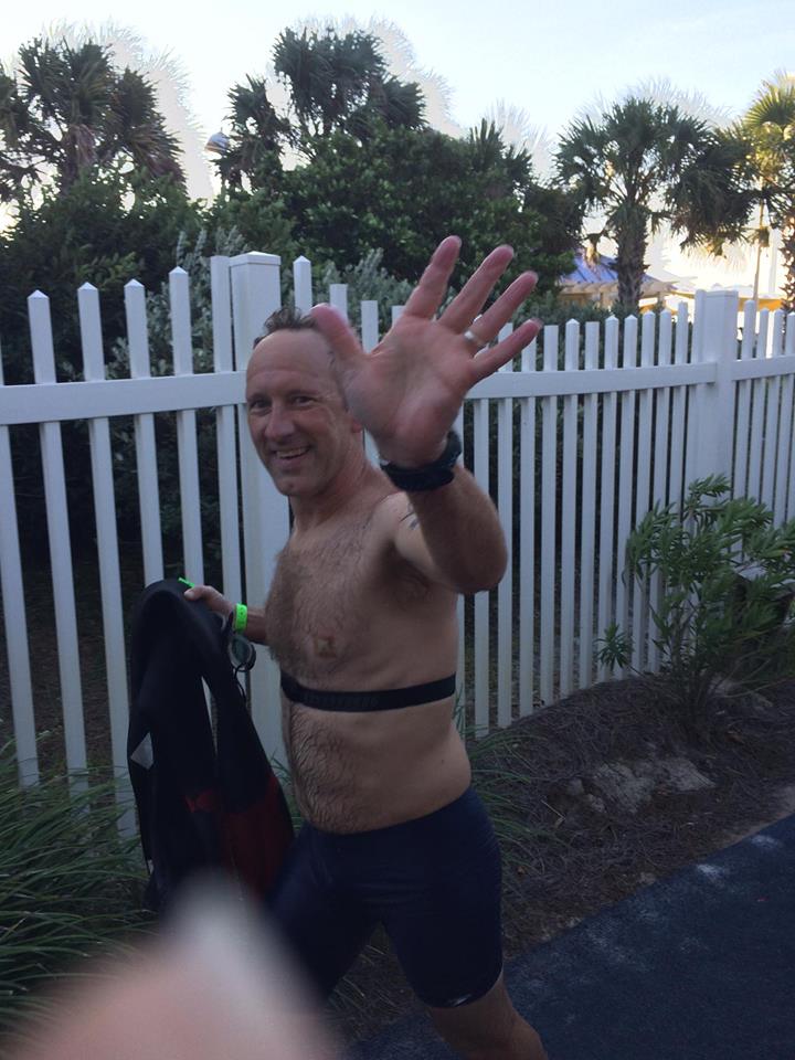 Thursday morning I drove over to the race beach to get in a practice swim. I planned on meeting up with a bunch of people from the Facebook group, but as I was walking over from my car, I struck up a conversation with a guy heading that way too. His name was Mike and he invited me to join his group instead. There were ten or so of them, mostly from North Carolina, and hanging out with them was a blast. Lots of joking, laughing, and words of encouragement from the veterans to the two of us rookies. A few of them practiced both with and without a wet suit in case the swim wasn’t wet suit legal, but I kept mine on the whole time. With no chance of apodium placement, there was no point in me not wearing it. The water during our swim was perfect – flat, calm, and clear – and allowed me to thoroughly test my suit for chafing, swim with both pairs of goggles, and practice sighting the finish line. A great morning of confidence building two days before the race.