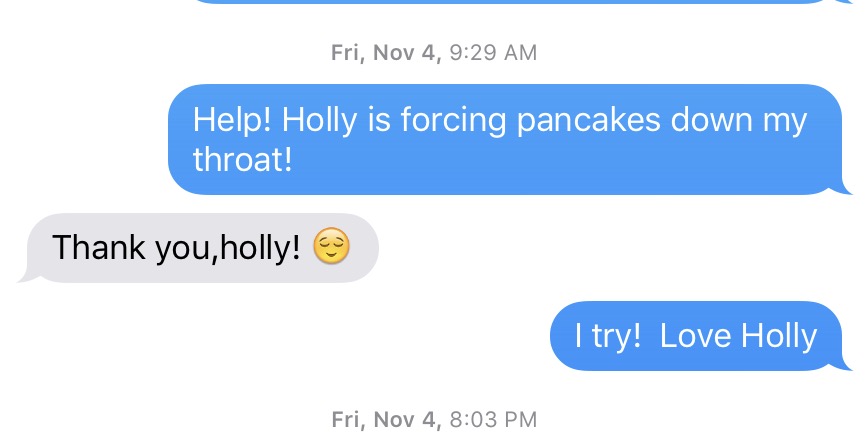 I ordered the three pancake breakfast with a side of eggs & bacon. Half an hour later, I felt like I was in an episode of Man vs. Food as I struggled to consume the last of the pancakes. During a break to snack on the bacon and gather myself for the last third of the last one, I sent a text to Mary asking for help. She had no mercy or pity.