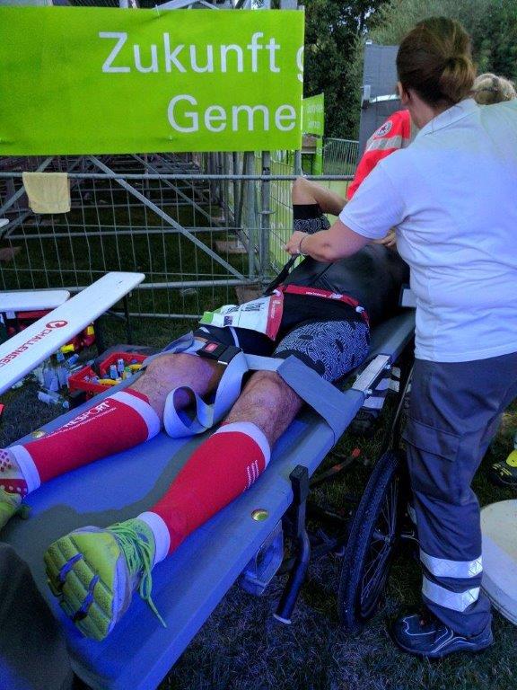 I find Jodi right in front of the finish line, I mumble a few words and then just lean on the fence trying to breathe and recover. Jodi jumps the fence to help me through to the athlete area, just around the corner we meet the medic team, jodi insists I lay on the bed… from there it’s off to the medic tent (full of athletes who have pushed to their limit). 2 doctors, an ultrasound, a drip, then its off to hospital. In hospital more tests, bloods, an ecg, an xray and the diagnosis is acute pneumonia! Well that explains a lot. A huge thanks to the Challenge medical team at Roth, they did a great job.